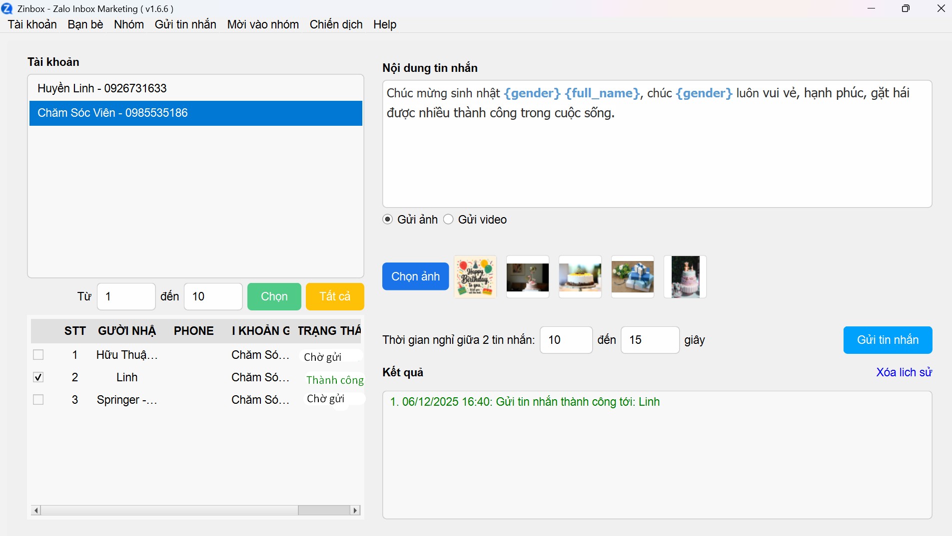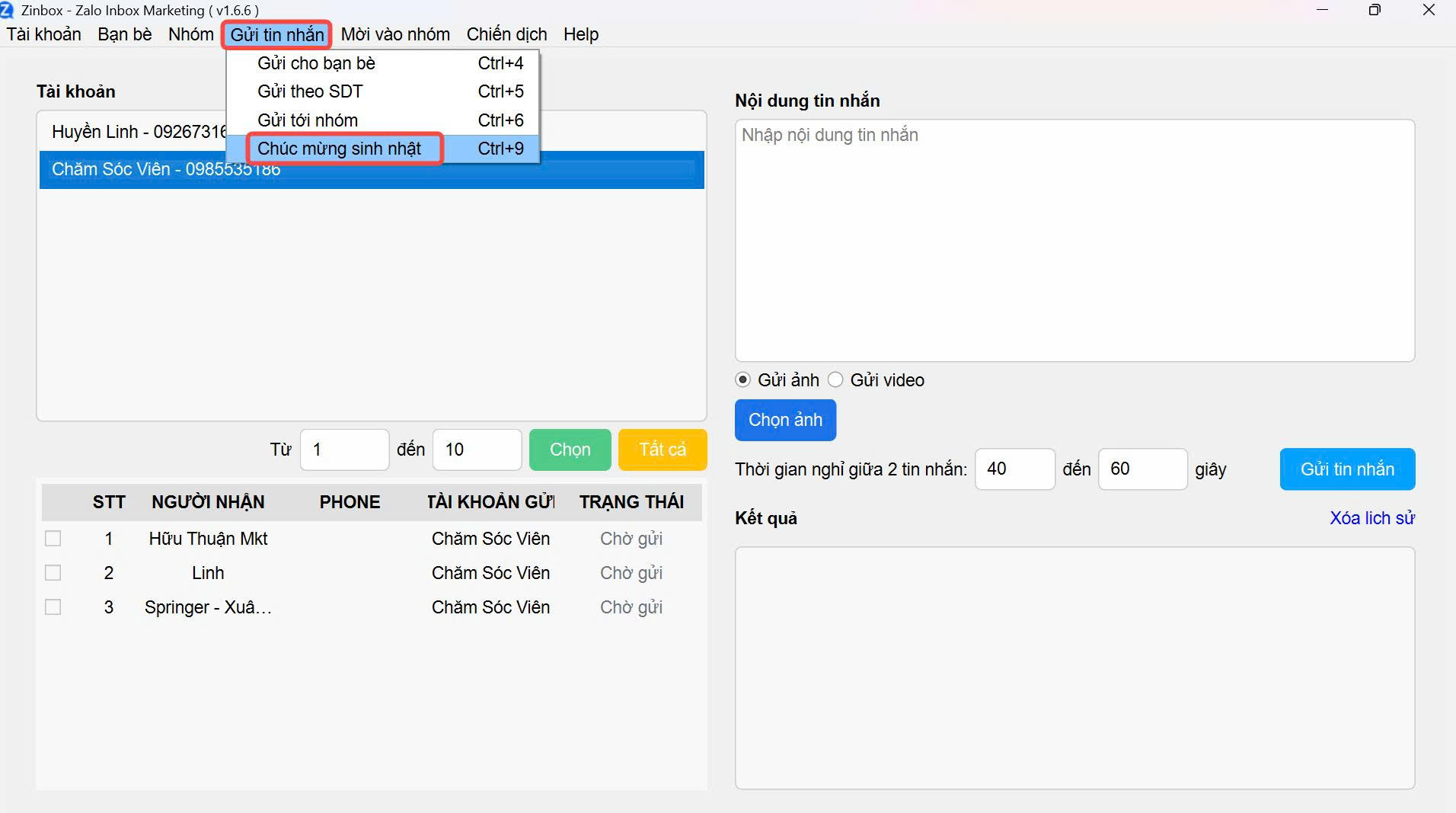 Bạn vào mục Gửi tin nhắn >> Chúc mừng sinh nhật >> chọn tài khoản zalo gửi tin, hệ thống sẽ quét danh sách bạn bè của nick zalo và chỉ hiển thị những bạn bè có thông tin ngày sinh là ngày hôm đó.