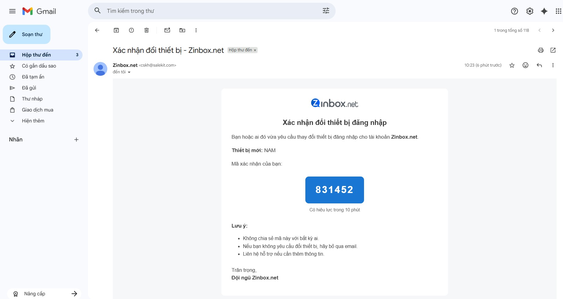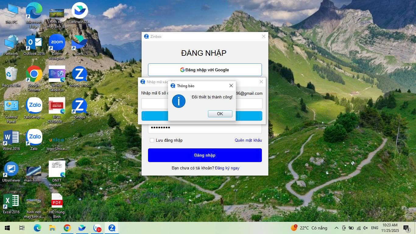 Sau khi nhập mã xác minh hợp lệ trên thiết bị mới đang đăng nhập tài khoản Zinbox, hệ thống sẽ có thông báo đổi thiết bị thành công và đăng nhập tài khoản trên thiết bị mới: