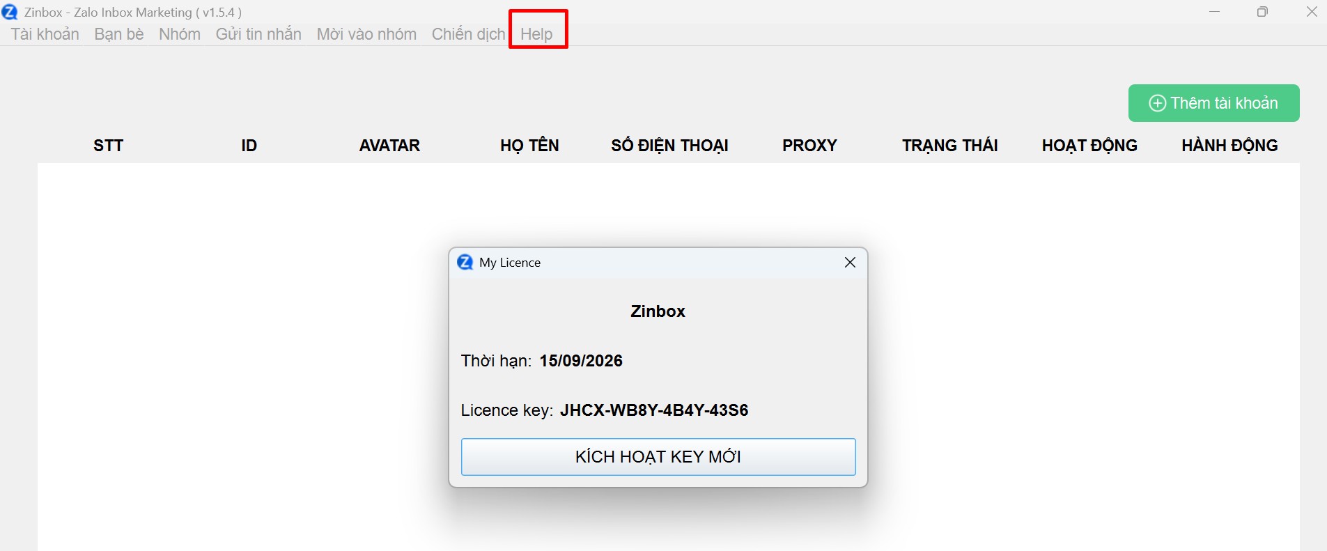 Bạn đăng nhập tài khoản trên app Zinbox.net >> Help >> Licence >> Kích hoạt key mới >> nhập mã key >> Tiếp tục.