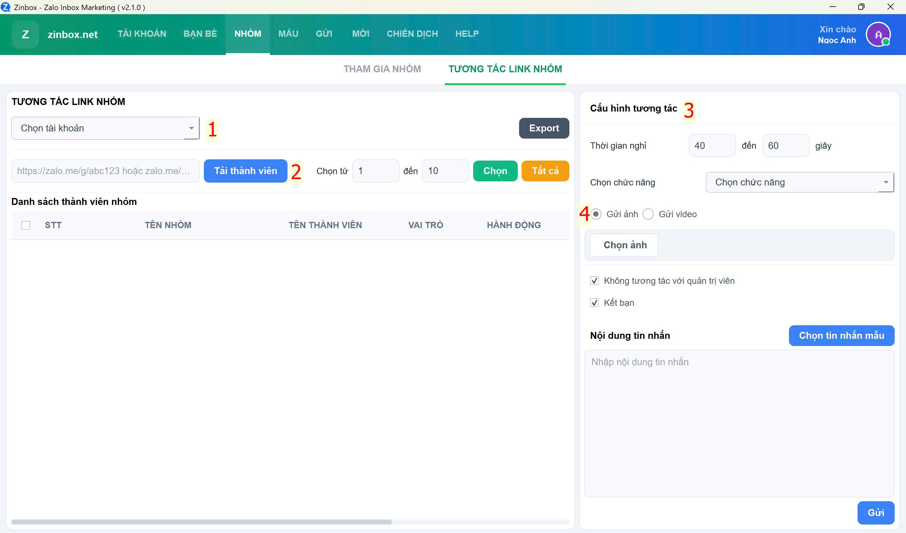 + Gửi tin nhắn và mời vào nhóm: Mời thành viên nhóm tham gia nhóm của mình.