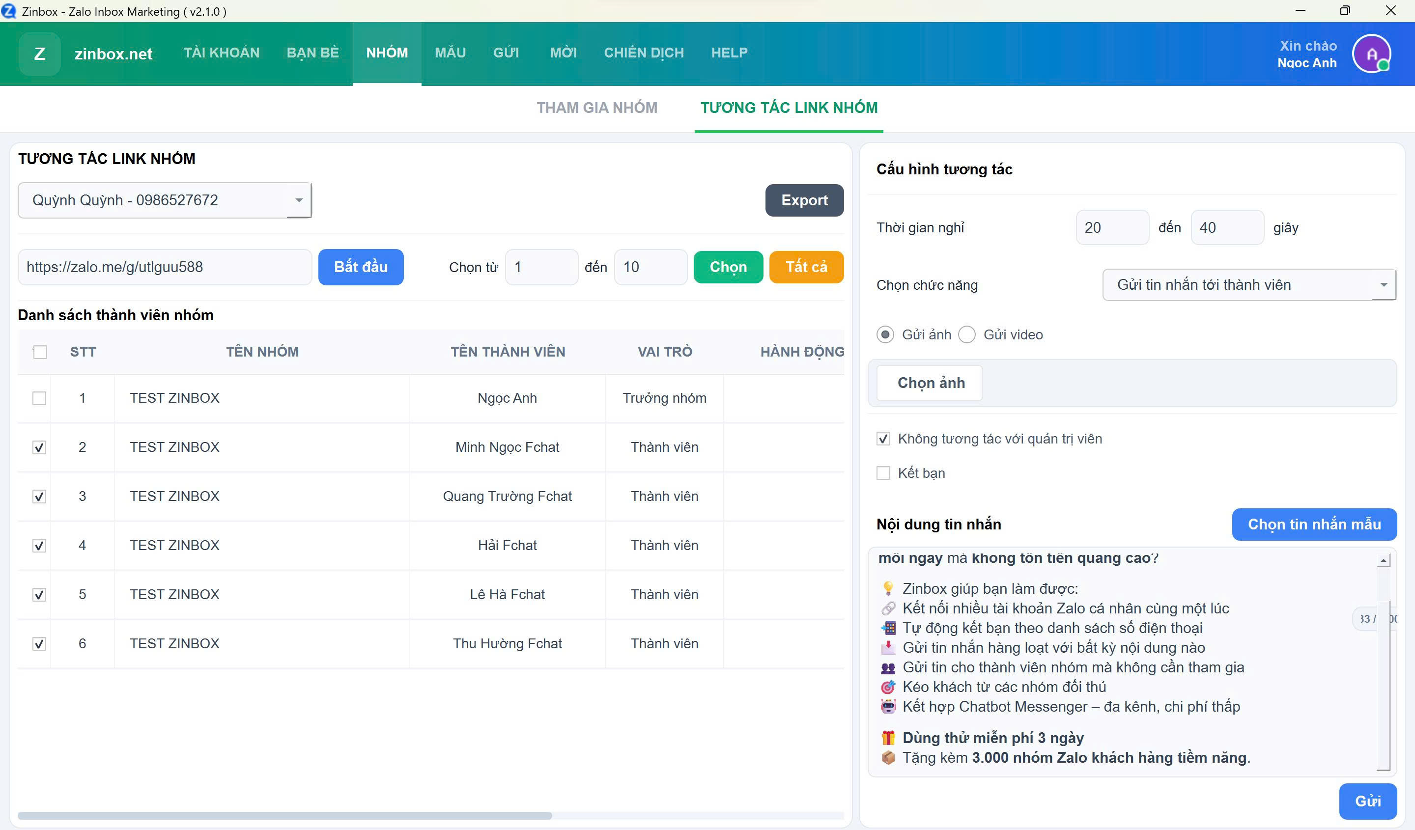 - Chọn số lượng thành viên nhóm để gửi tin
