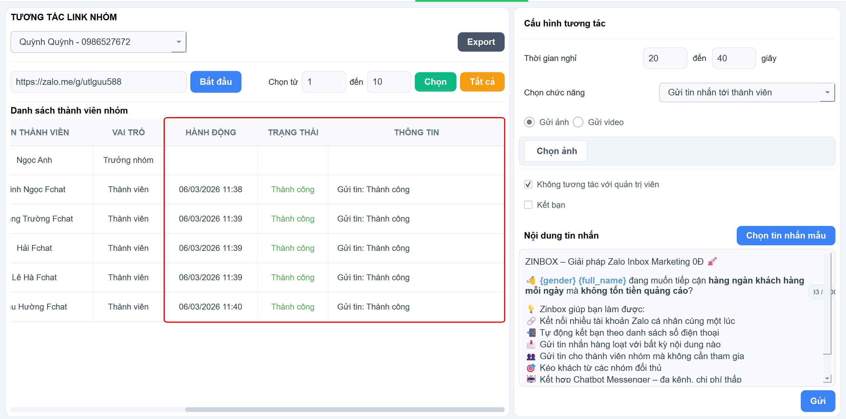 + Với thành viên nhóm đã là bạn bè với tài khoản zalo gửi, hệ thống sẽ gửi tin nhắn đồng thời thêm thành viên đó vào nhóm đích